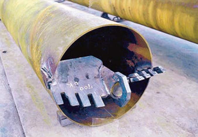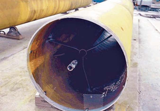 鋼管杭の先端に掘削撹拌翼(写真-1)を溶接にて取付け、導水パイプ(写真-2)を取付けた鋼管杭を削孔水を噴出させながら回転圧入する工法です。